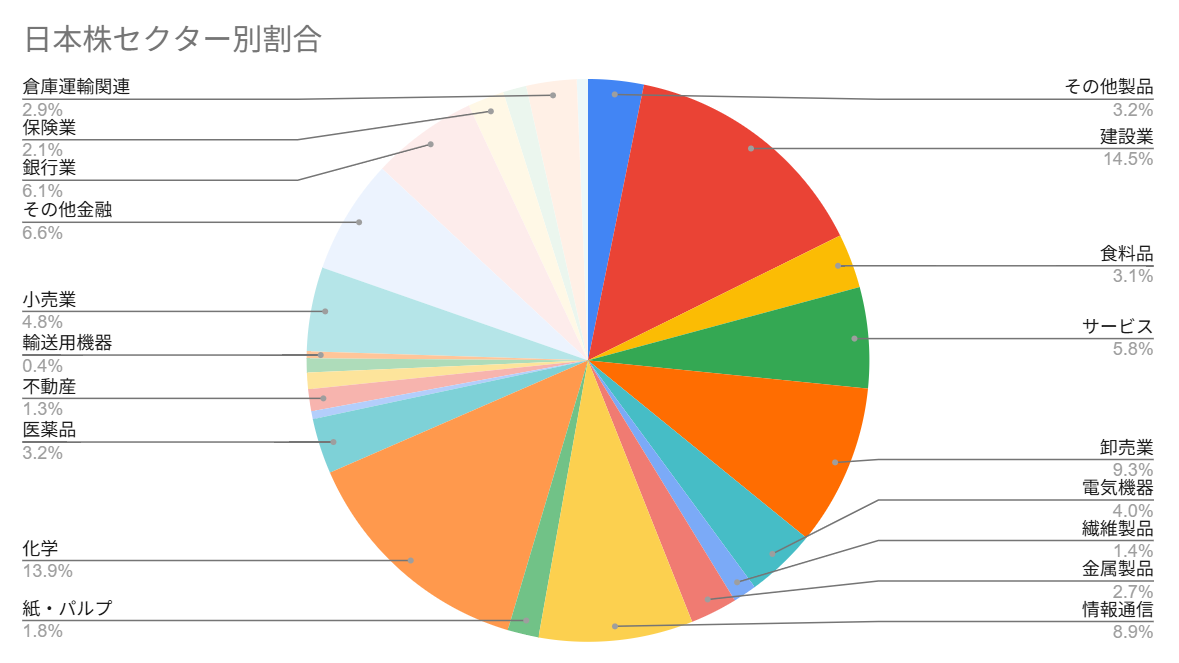 となっています。セクター別では建設業と化学が入れ替わっています。引き続き、分散投資を図っていきます。