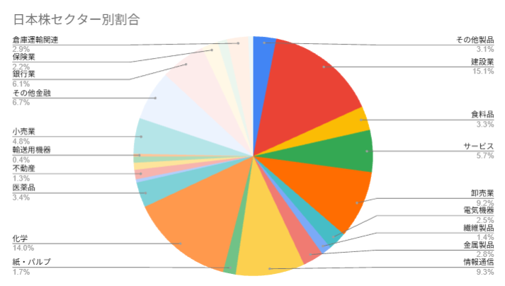 となっています。セクター別では建設業と化学が入れ替わっています。引き続き、分散投資を図っていきます。