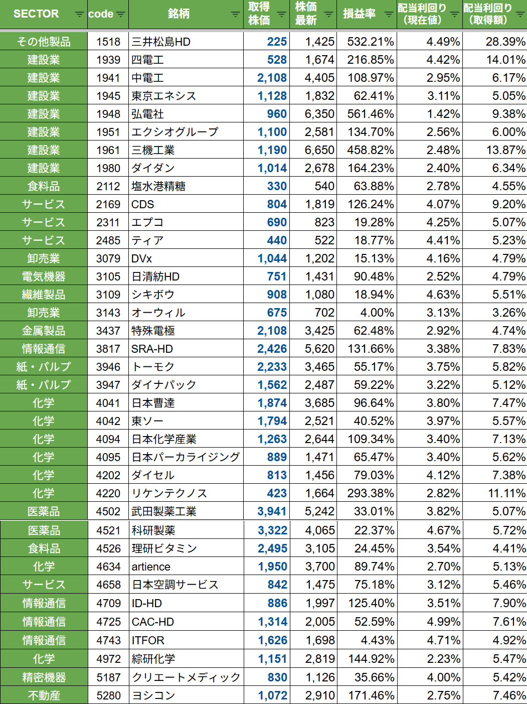 今月もポートフォリオの多くが上昇に転じたほか1948弘電社や1961三機工業など建設セクターの上昇が目立ちました。