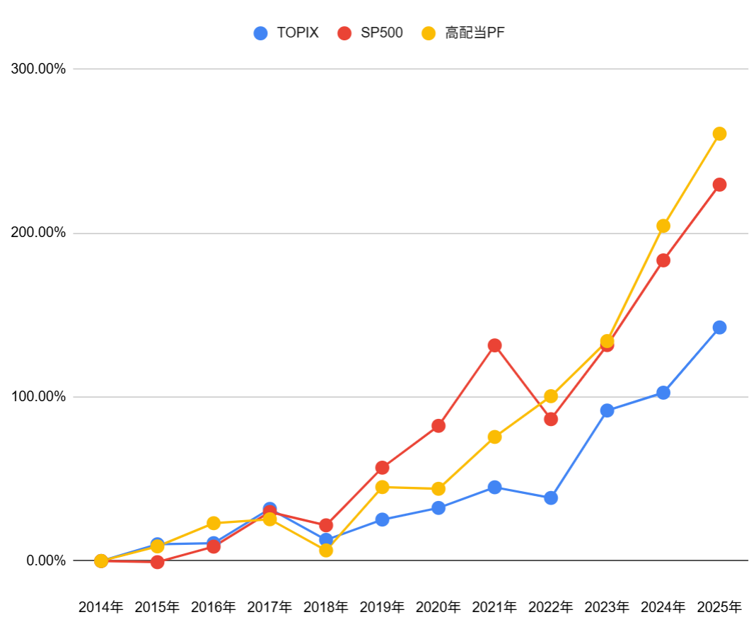 こちらの図は、過去10年間におけるインデックスとの比較です。TOPIXやS&P500と比較してもわが高配当株投資がアウトパフォームしています。