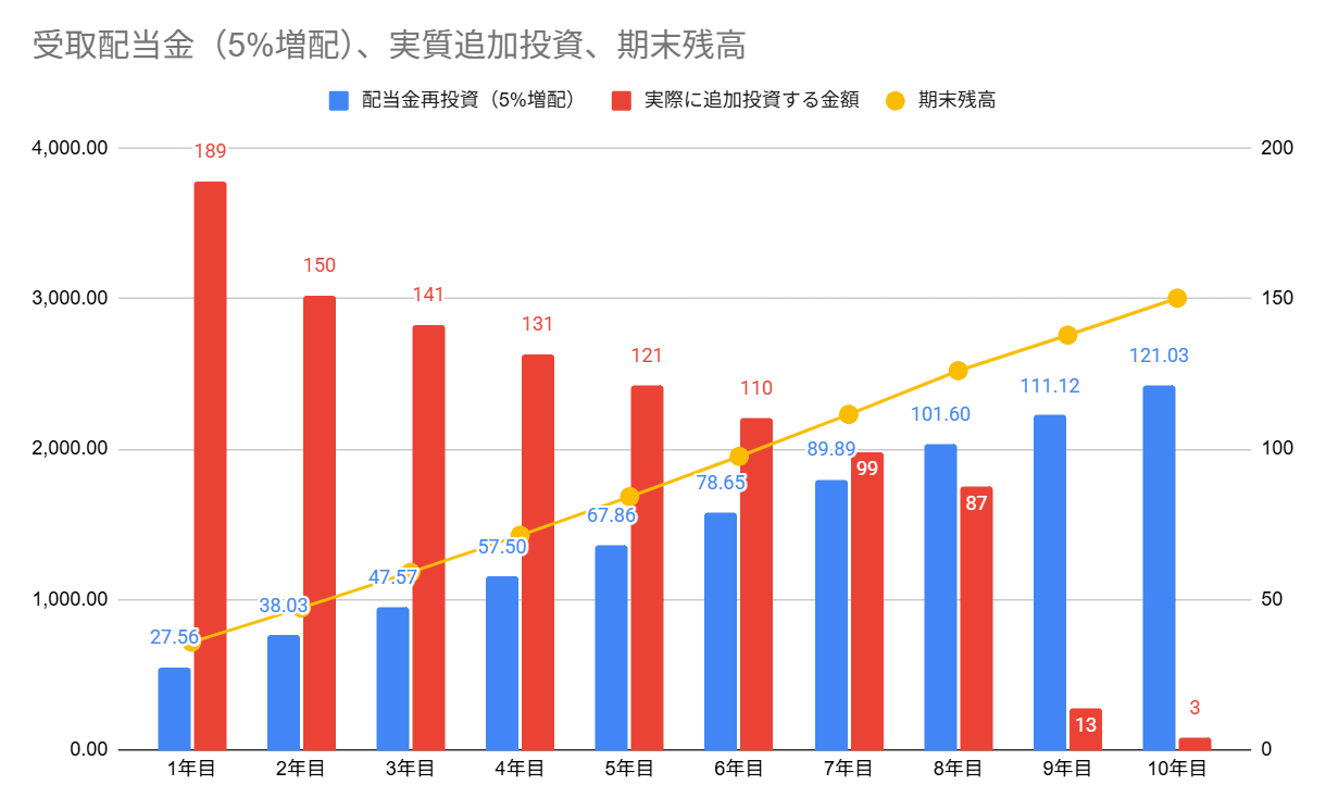 実際は、配当金再投資分も含めるので、収入から投資に回す金額は想定よりも少なく済みます。